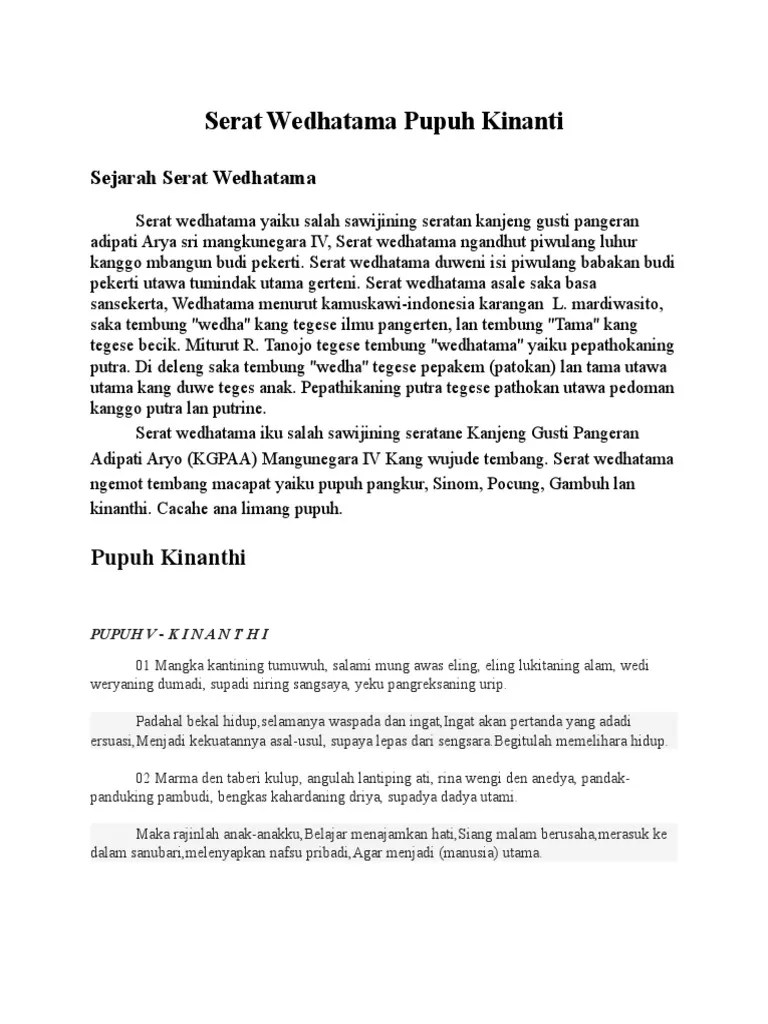 serat wedhatama serat wedhatama adalah sastra tembang atau kidungan jawa karya mangkunegara iv wedhatama berasal dalam bahasa jawa paugeran tembang gambuh. Guru gatra, yaiku cacahe larik/gatra saben pada (bait).